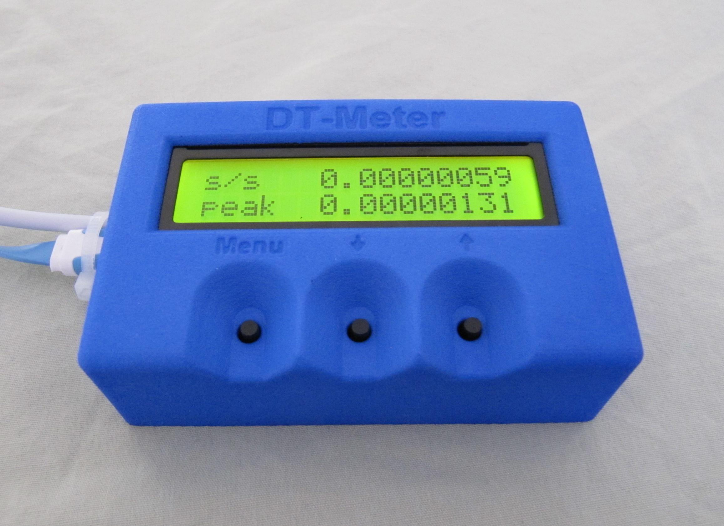 The DT-Meter will self calibrate for 6 seconds when it is first plugged in. After the auto-calibrate is complete, there will be a short beep each time that the reading becomes large enough to change the peak value. There are two values displayed, the top line is the present value that is updated twice per second. The top line has the label: “s/s” and then a number. The s/s is short for seconds per second, and is the difference in time rate averaged over the last 5 seconds.