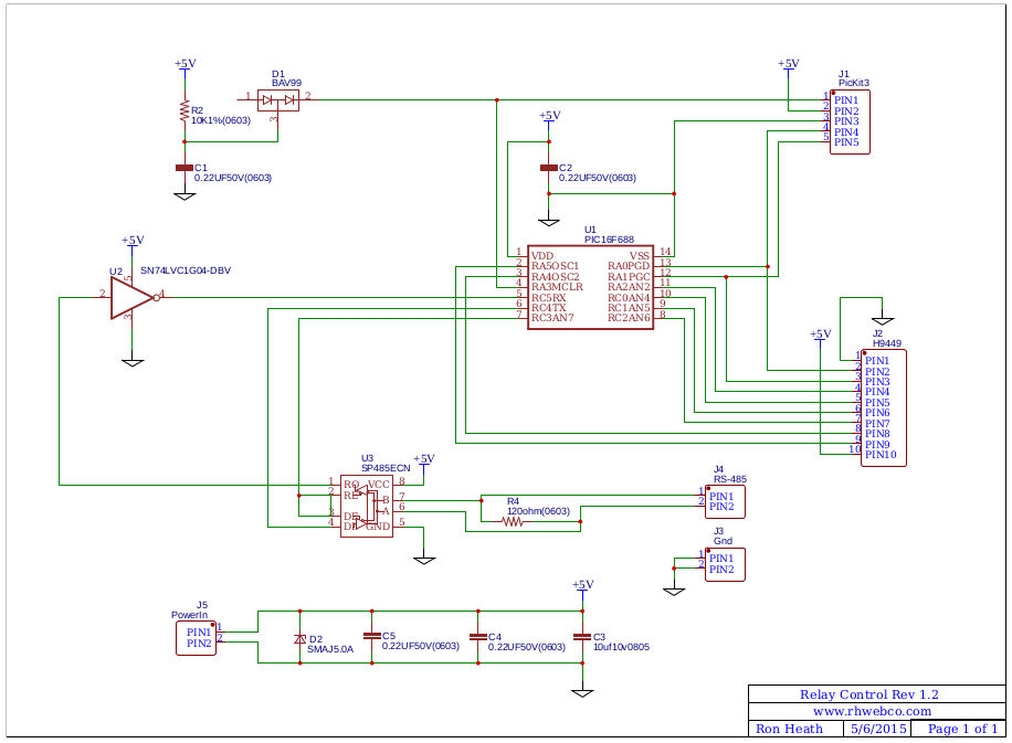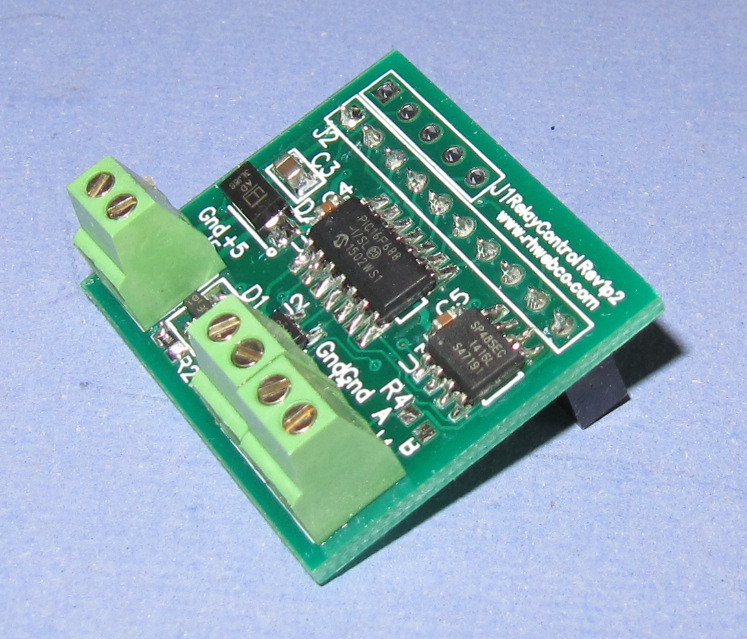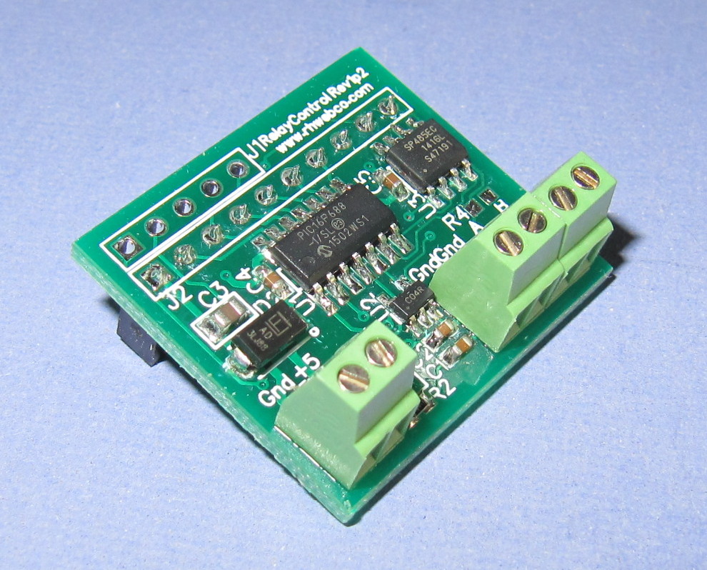 This board will control an 8 channel 5V relay board (HL-58S) in response to commands sent via RS-485. The relay board is commonly sold on ebay for less than $10.00. This board is also sold on ebay, search for “Relay Board Controller, RS-485 PIC”.
