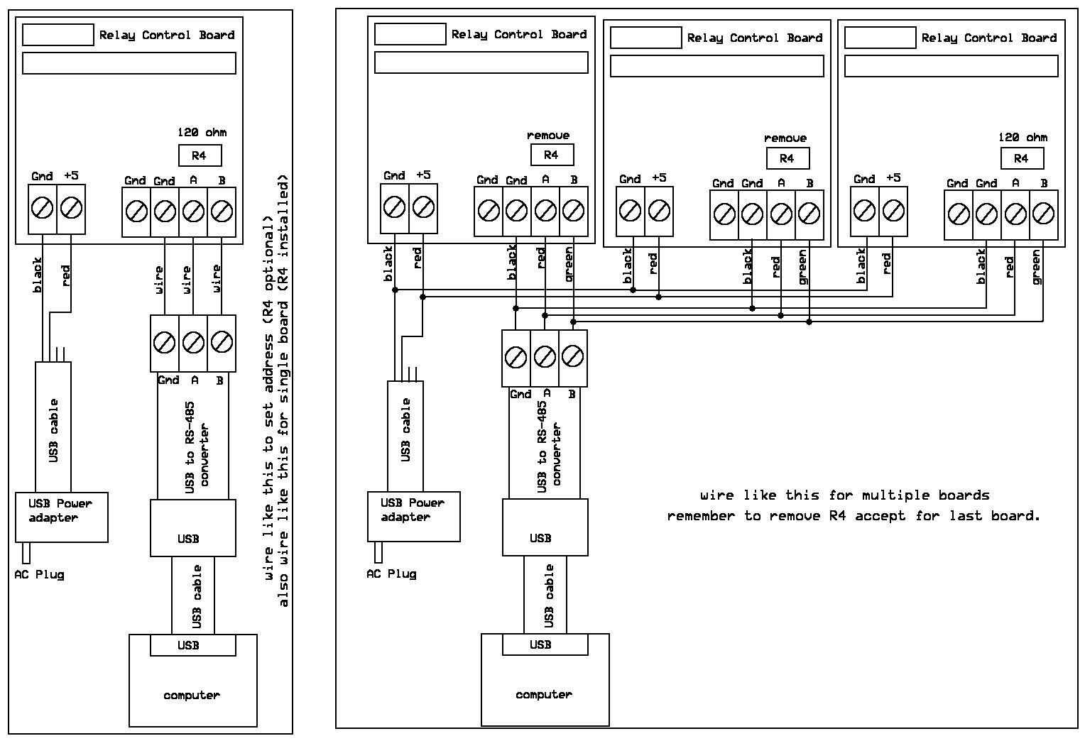 Before connecting multiple boards together, each board should be connected to the host and the host should send the set address command. This address will be stored inside of the relay control board even after the power has been turned off. When multiple boards have been connected together, each board will only respond to commands that have the address that was set.